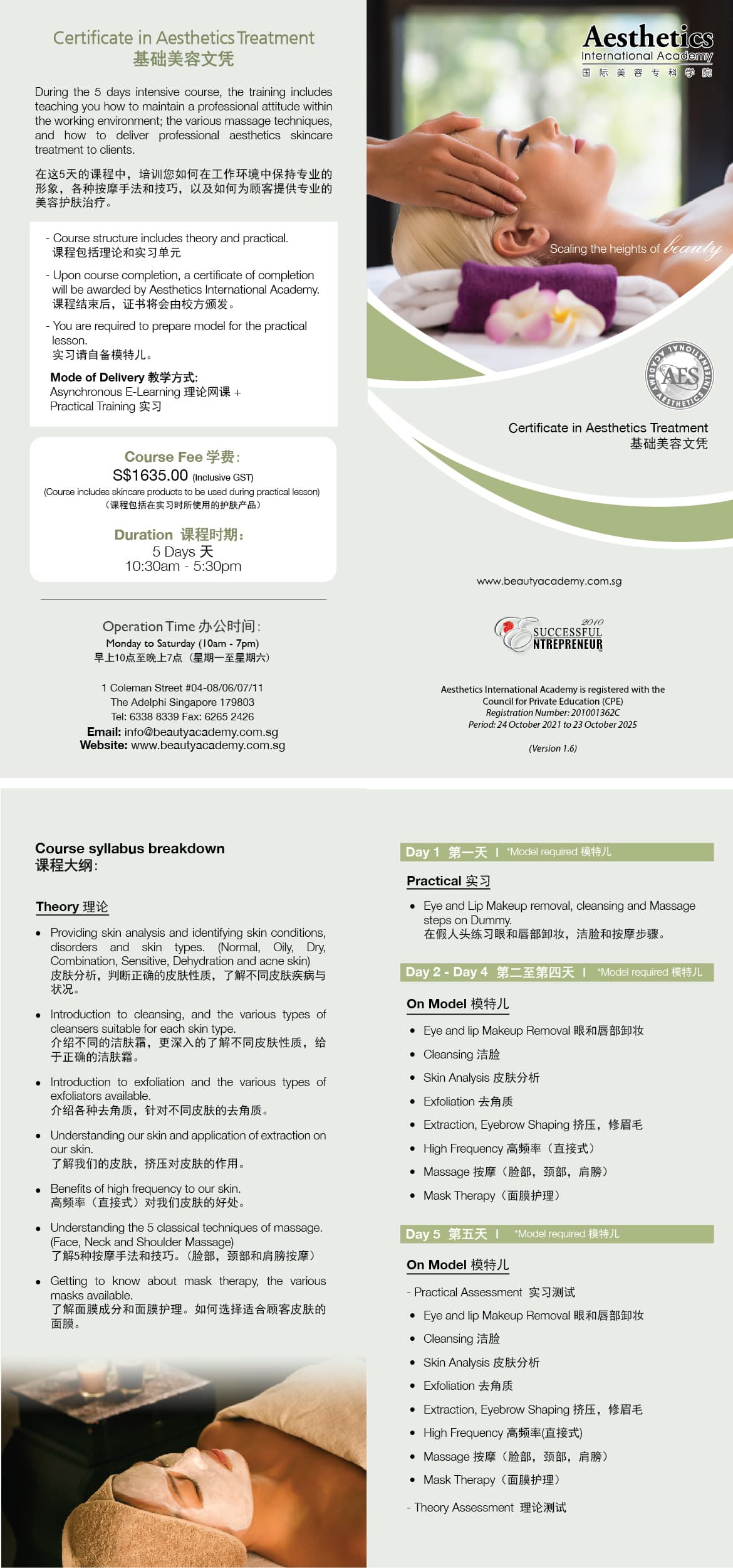 During the 5 days intensive course, the training includes teaching you how to maintain a professional attitude within the working environment; the various massage techniques, and how to deliver professional aesthetics skincare treatment to clients.